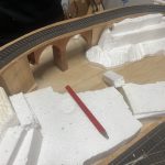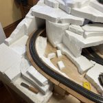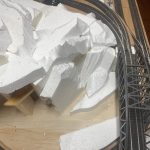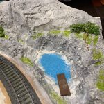 Die Anlage befindet sich im Landschaftsaufbau. Gleisbau mit Doppel-Wendemöglichkeit und Bergbahnhof sind fertiggestellt. Erste Landschaftsteile, wie z.B. der seitliche Bergzug mit Weiher und Tropfsteinhöhle sind schon in der Endphase. Aktuell ist die Überbauung der Gleise mit Bergen, Brücken und mehreren Tunneln in Arbeit. Weiter geht es dann mit dem Modellieren der Berge. Gebäude und andere Installationen sind teilweise noch in der Planungsphase.