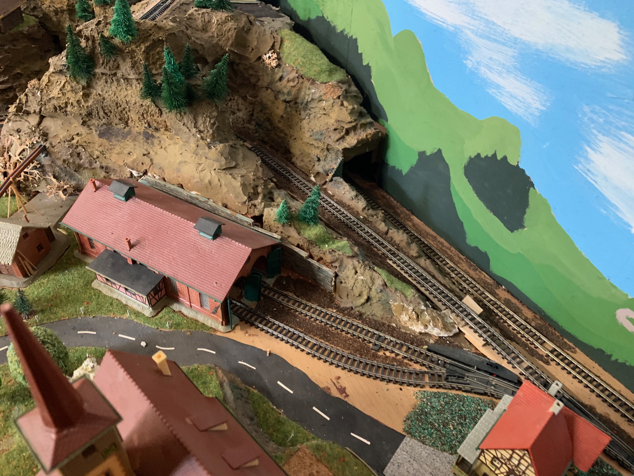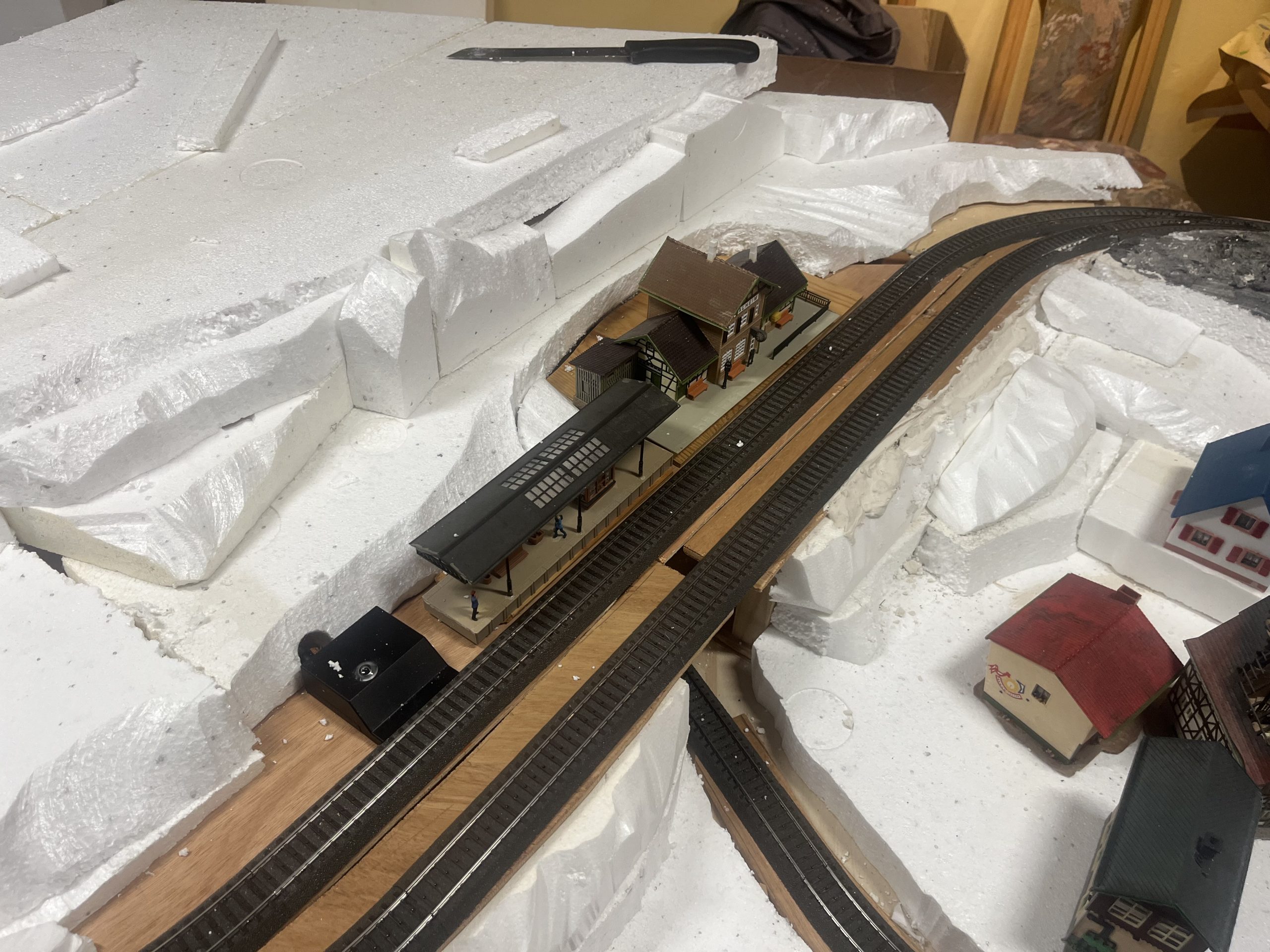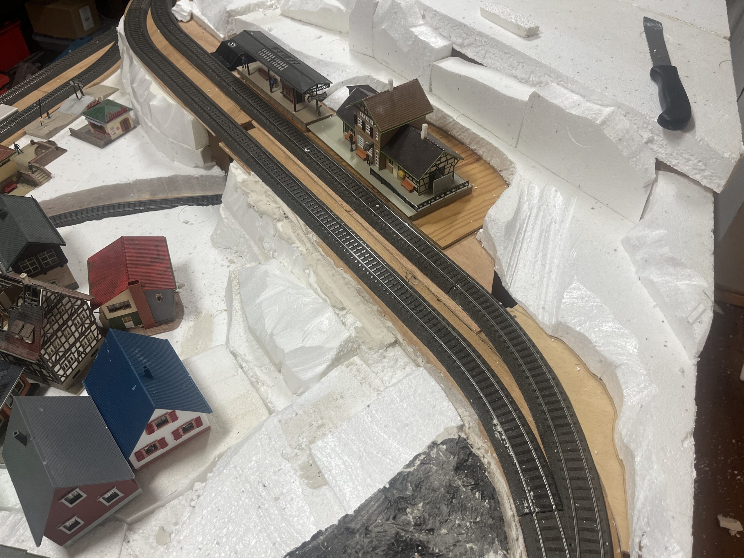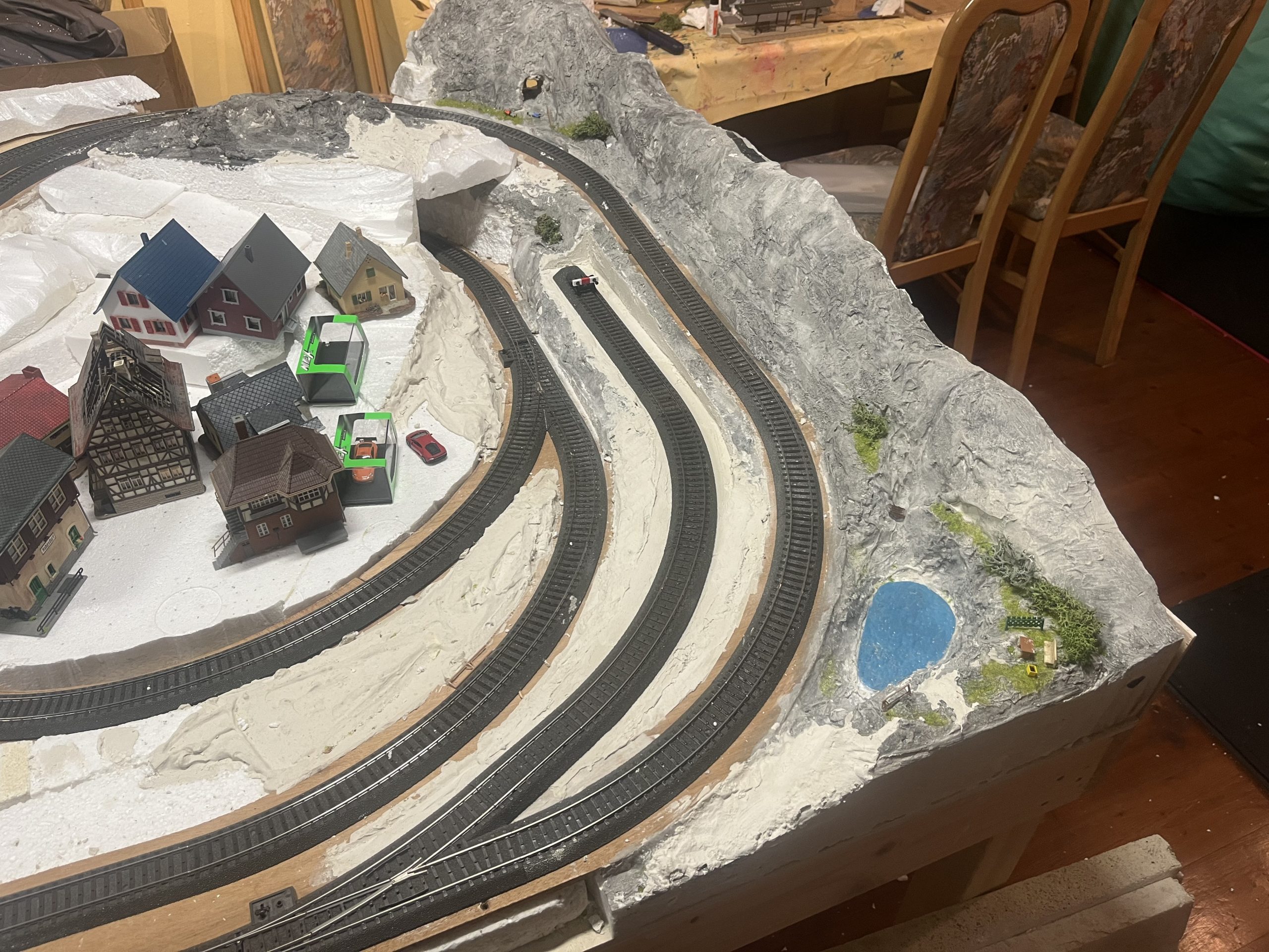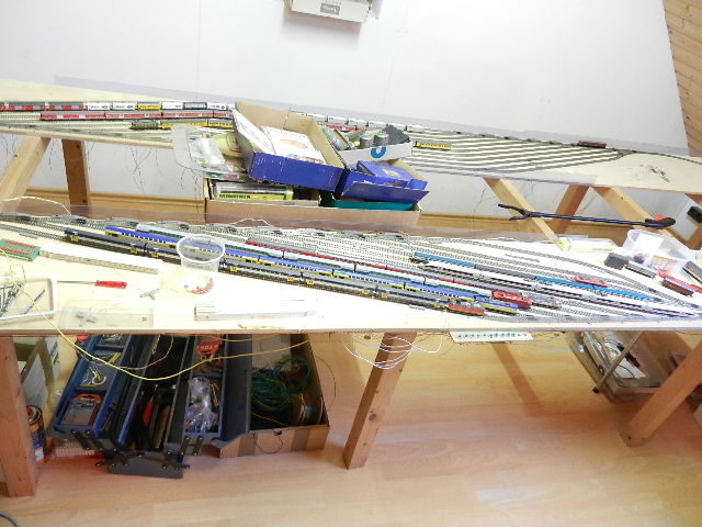 Die Anlage befindet sich im Landschaftsaufbau. Gleisbau mit Doppel-Wendemöglichkeit und Bergbahnhof sind fertiggestellt. Erste Landschaftsteile, wie z.B. der seitliche Bergzug mit Weiher und Tropfsteinhöhle sind schon in der Endphase. Aktuell ist die Überbauung der Gleise mit Bergen, Brücken und mehreren Tunneln in Arbeit. Weiter geht es dann mit dem Modellieren der Berge. Gebäude und andere Installationen sind teilweise noch in der Planungsphase.