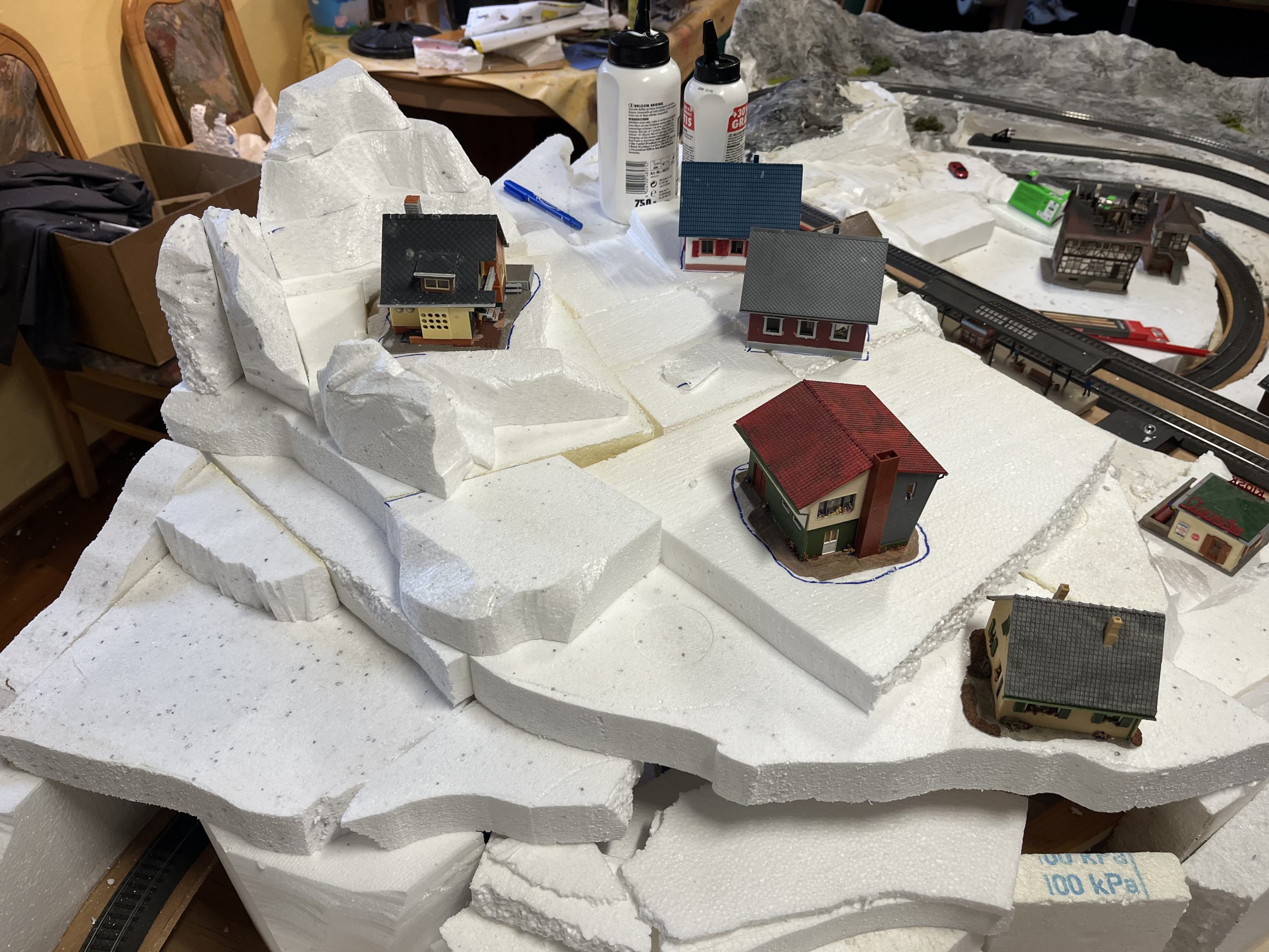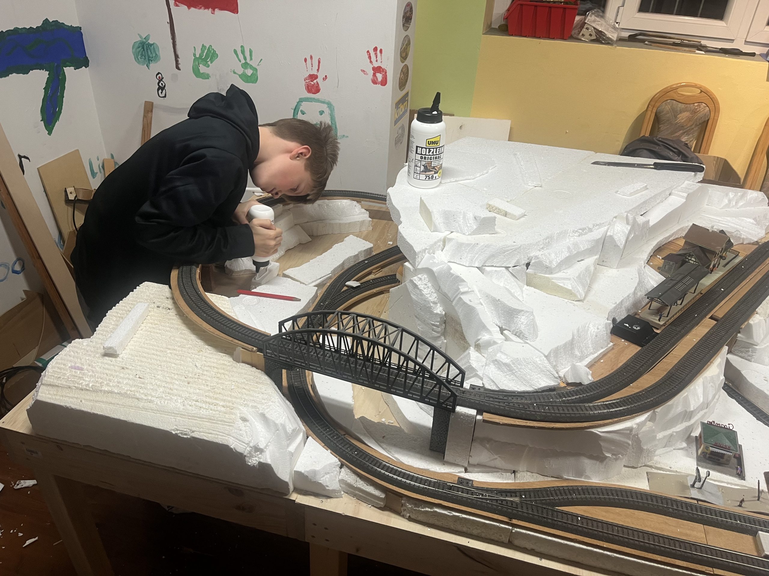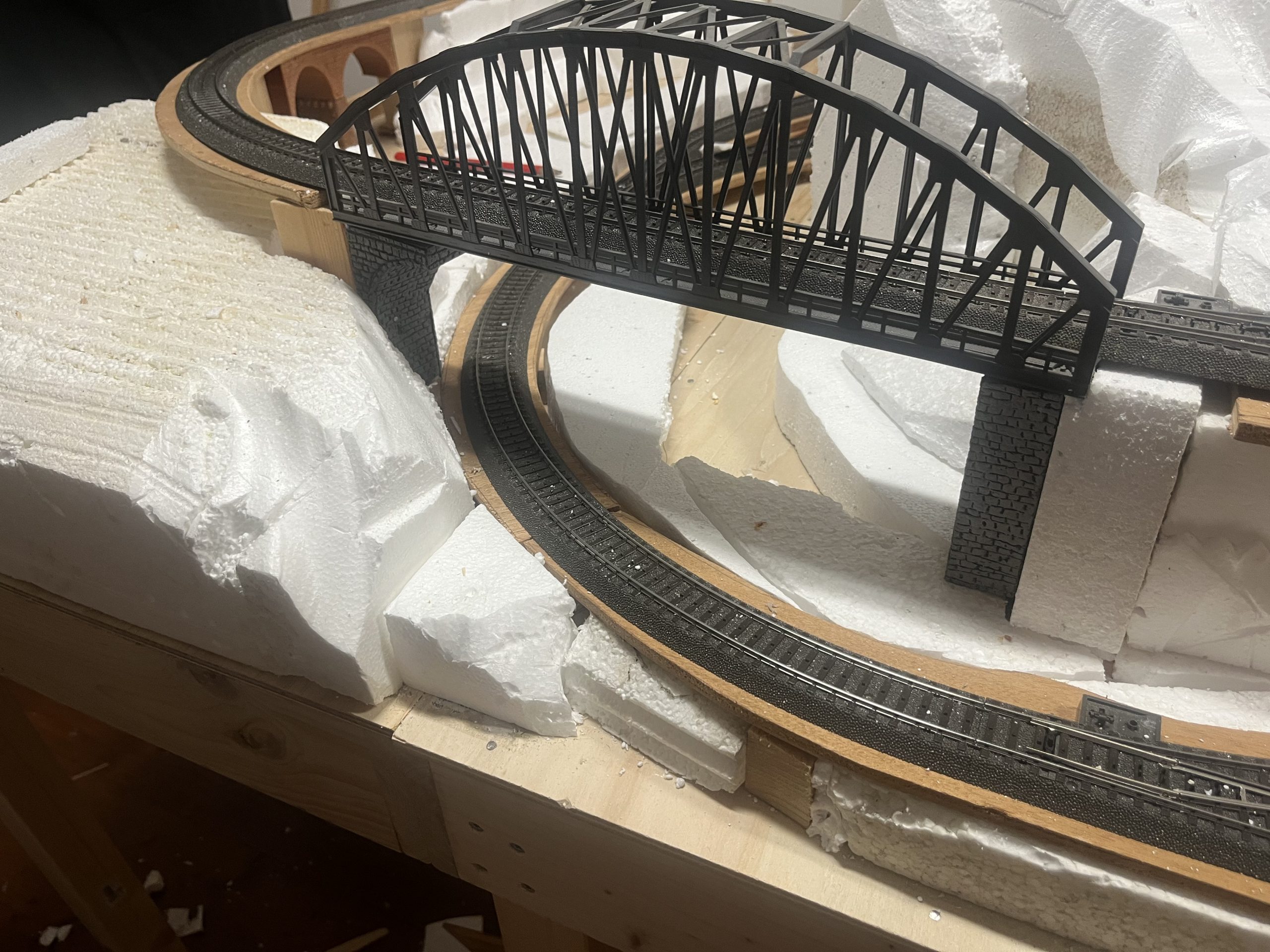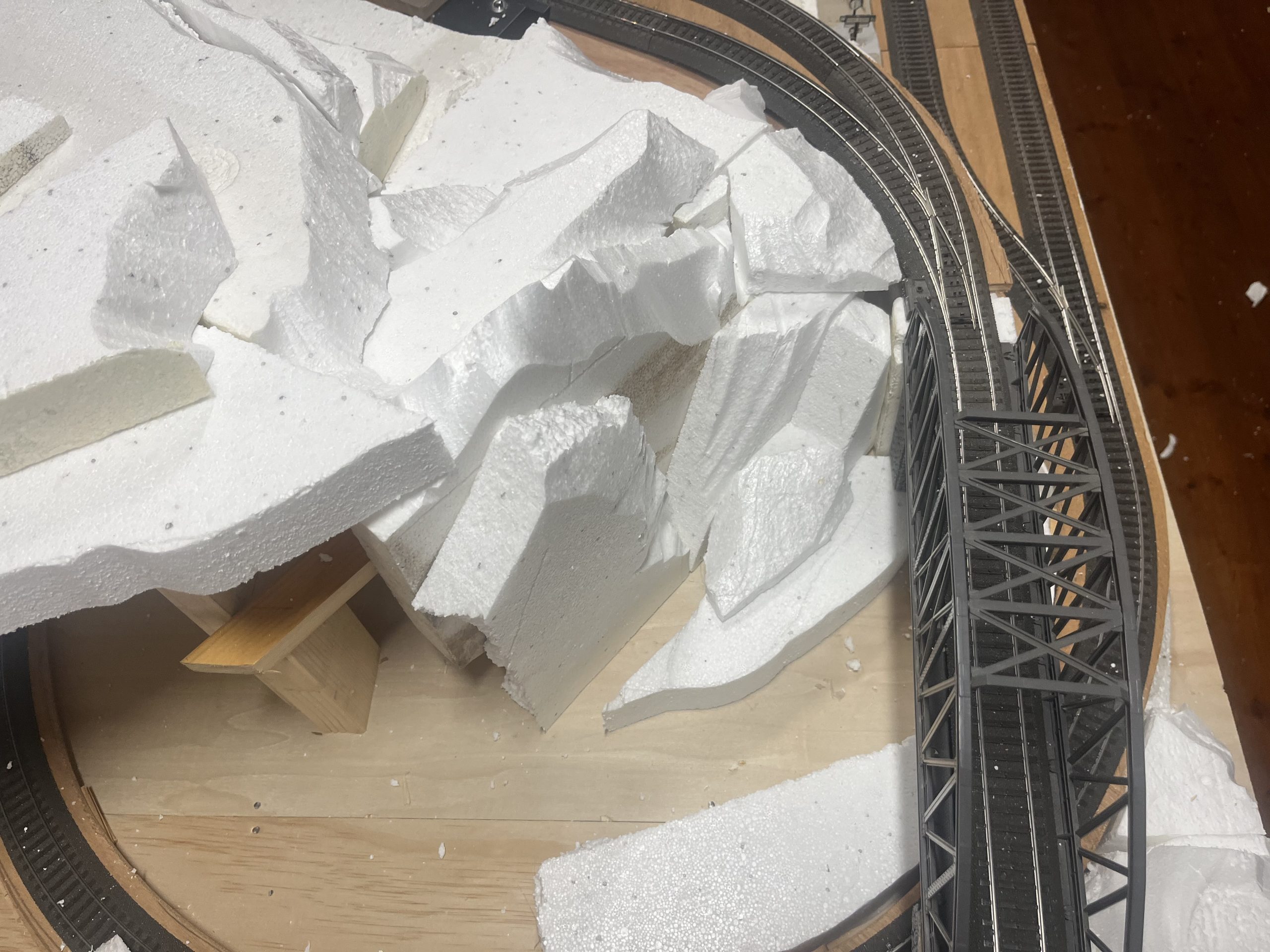 Die Anlage befindet sich im Landschaftsaufbau. Gleisbau mit Doppel-Wendemöglichkeit und Bergbahnhof sind fertiggestellt. Erste Landschaftsteile, wie z.B. der seitliche Bergzug mit Weiher und Tropfsteinhöhle sind schon in der Endphase. Aktuell ist die Überbauung der Gleise mit Bergen, Brücken und mehreren Tunneln in Arbeit. Weiter geht es dann mit dem Modellieren der Berge. Gebäude und andere Installationen sind teilweise noch in der Planungsphase.