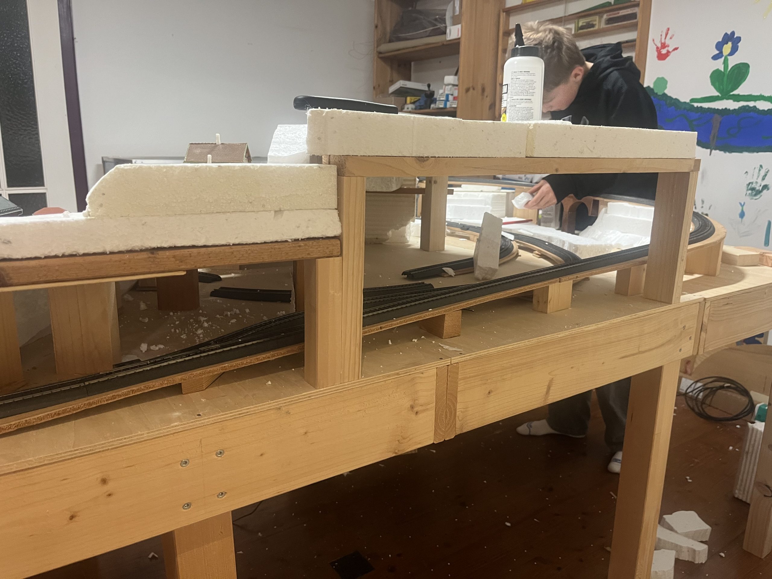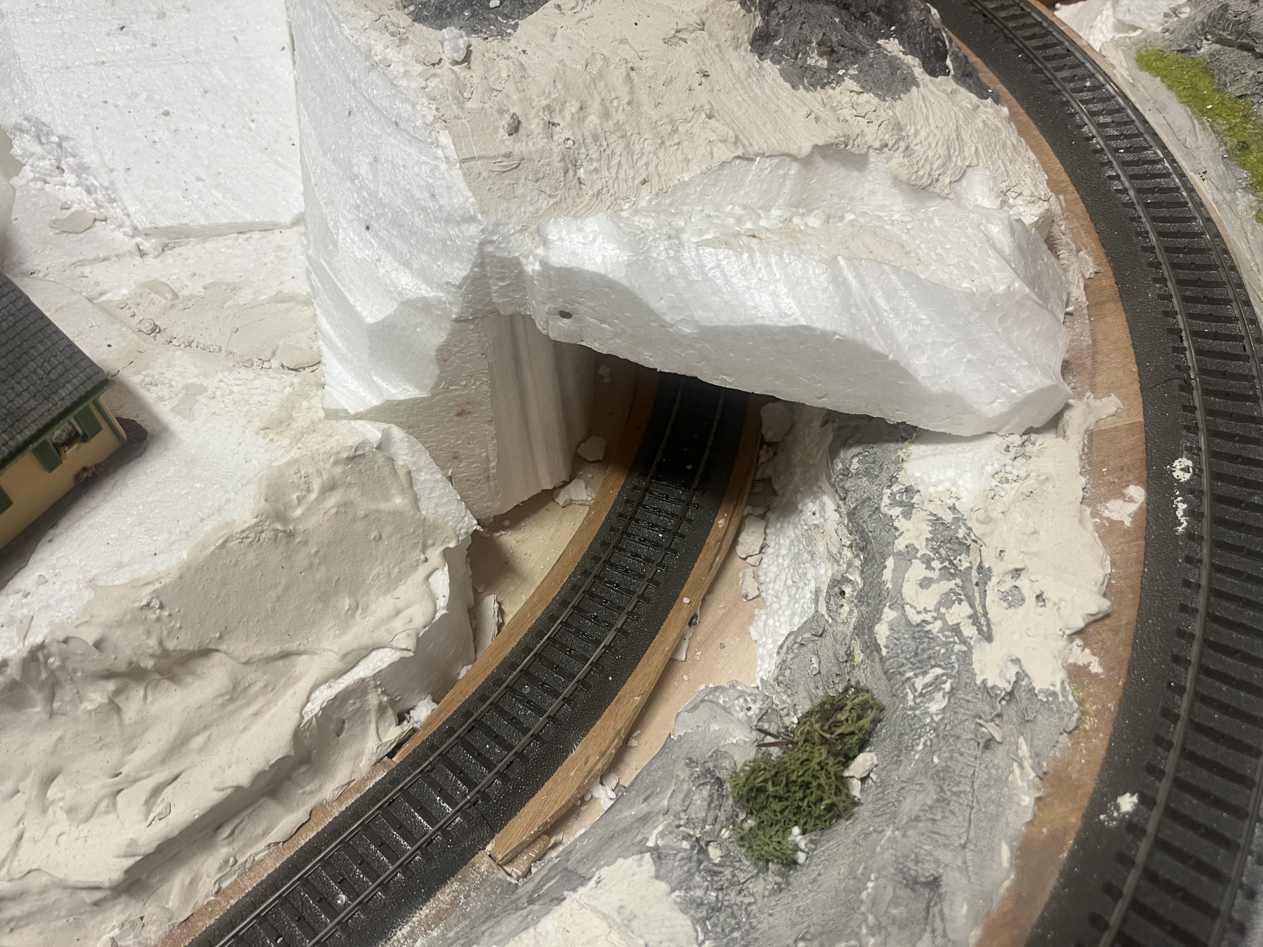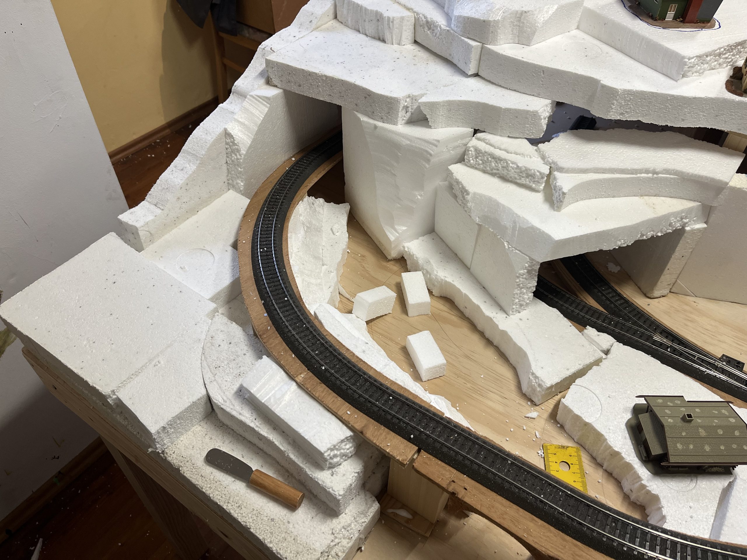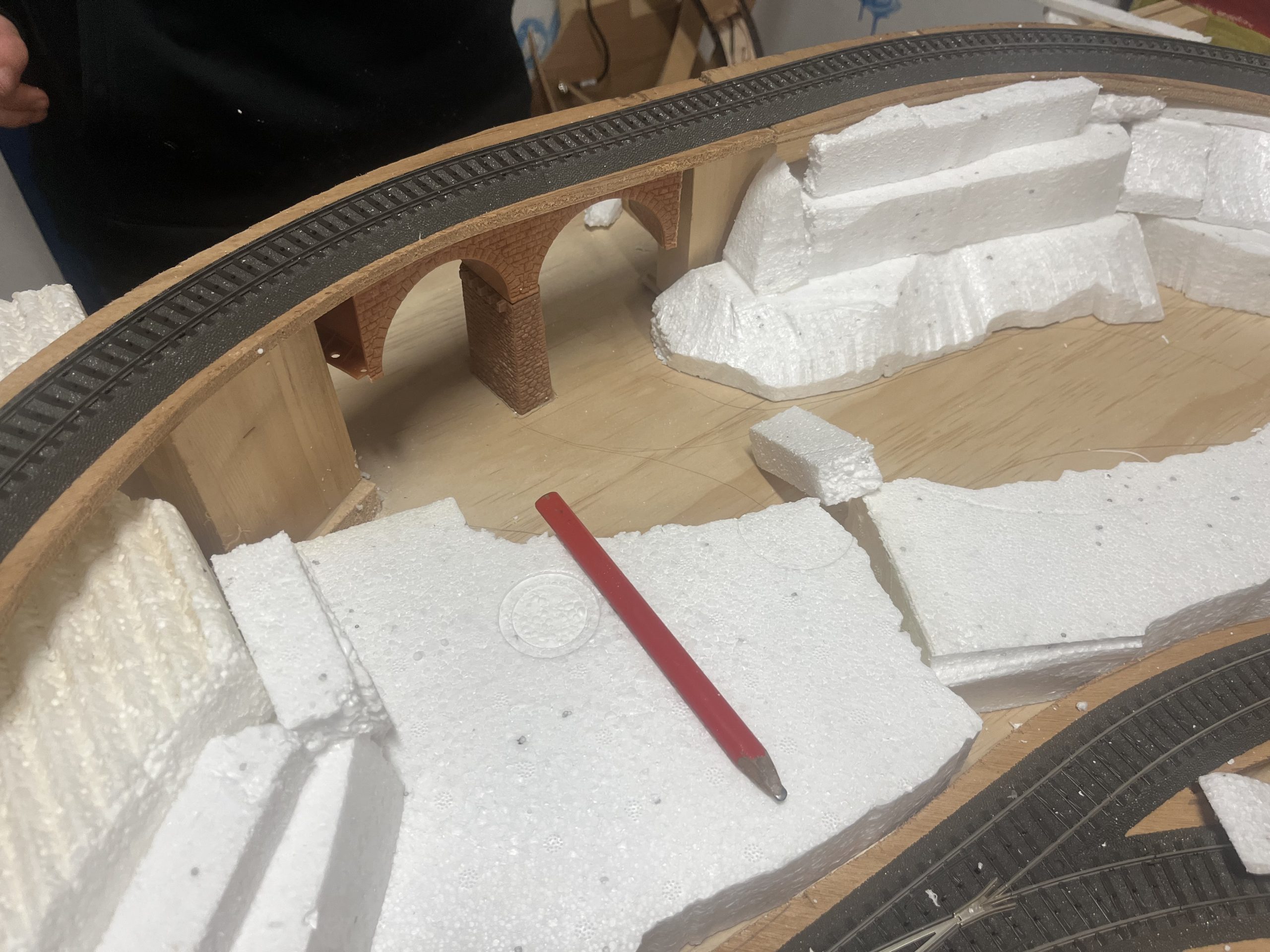 Die Anlage befindet sich im Landschaftsaufbau. Gleisbau mit Doppel-Wendemöglichkeit und Bergbahnhof sind fertiggestellt. Erste Landschaftsteile, wie z.B. der seitliche Bergzug mit Weiher und Tropfsteinhöhle sind schon in der Endphase. Aktuell ist die Überbauung der Gleise mit Bergen, Brücken und mehreren Tunneln in Arbeit. Weiter geht es dann mit dem Modellieren der Berge. Gebäude und andere Installationen sind teilweise noch in der Planungsphase.
