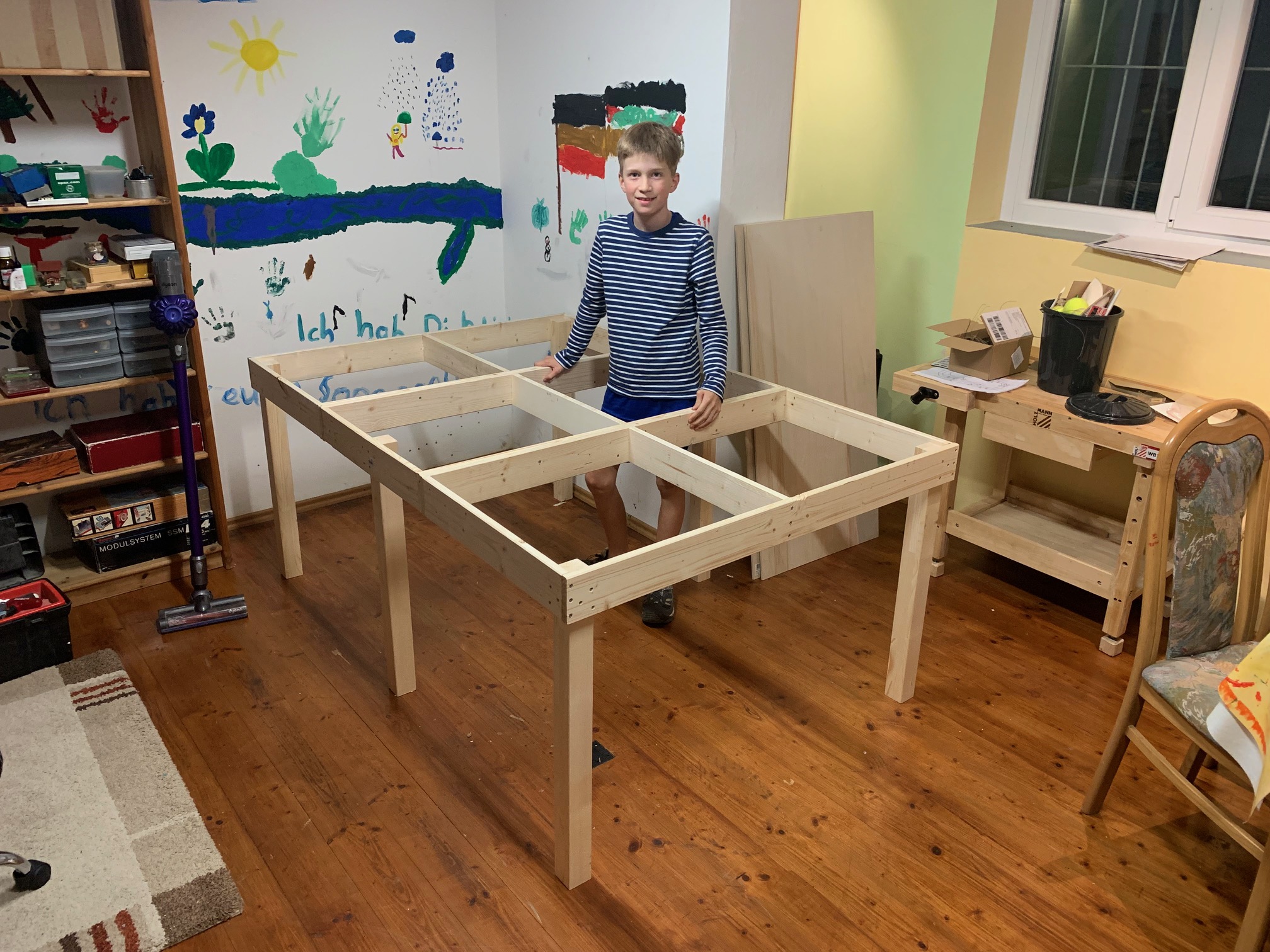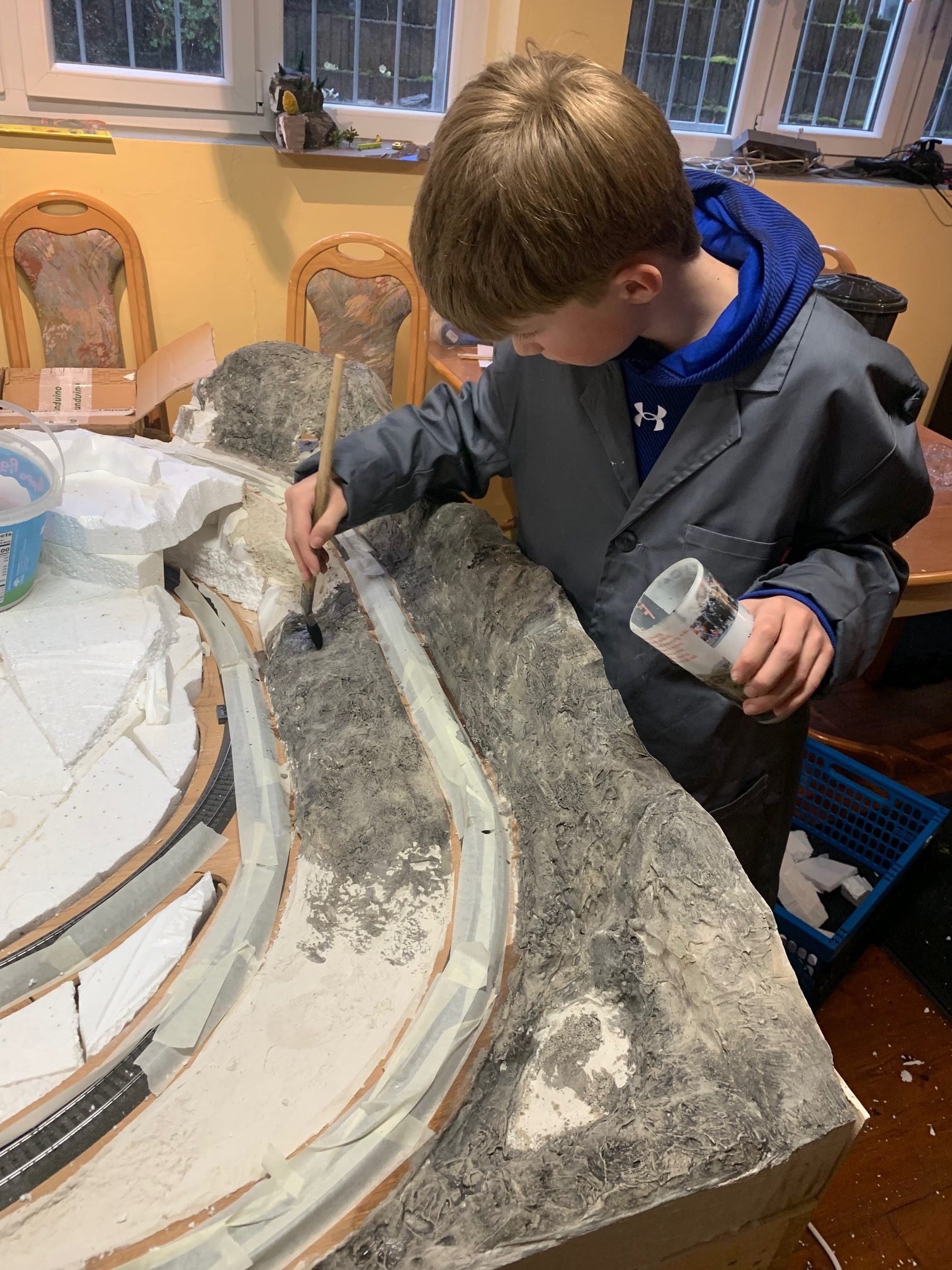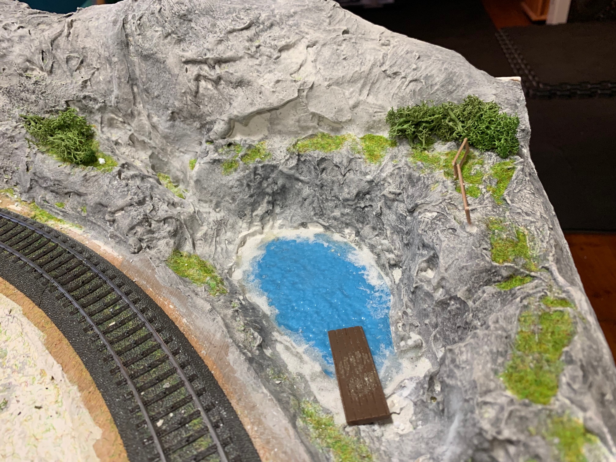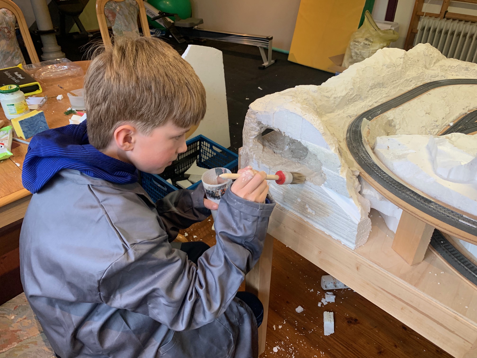 Die Anlage befindet sich im Landschaftsaufbau. Gleisbau mit Doppel-Wendemöglichkeit und Bergbahnhof sind fertiggestellt. Erste Landschaftsteile, wie z.B. der seitliche Bergzug mit Weiher und Tropfsteinhöhle sind schon in der Endphase. Aktuell ist die Überbauung der Gleise mit Bergen, Brücken und mehreren Tunneln in Arbeit. Weiter geht es dann mit dem Modellieren der Berge. Gebäude und andere Installationen sind teilweise noch in der Planungsphase.
