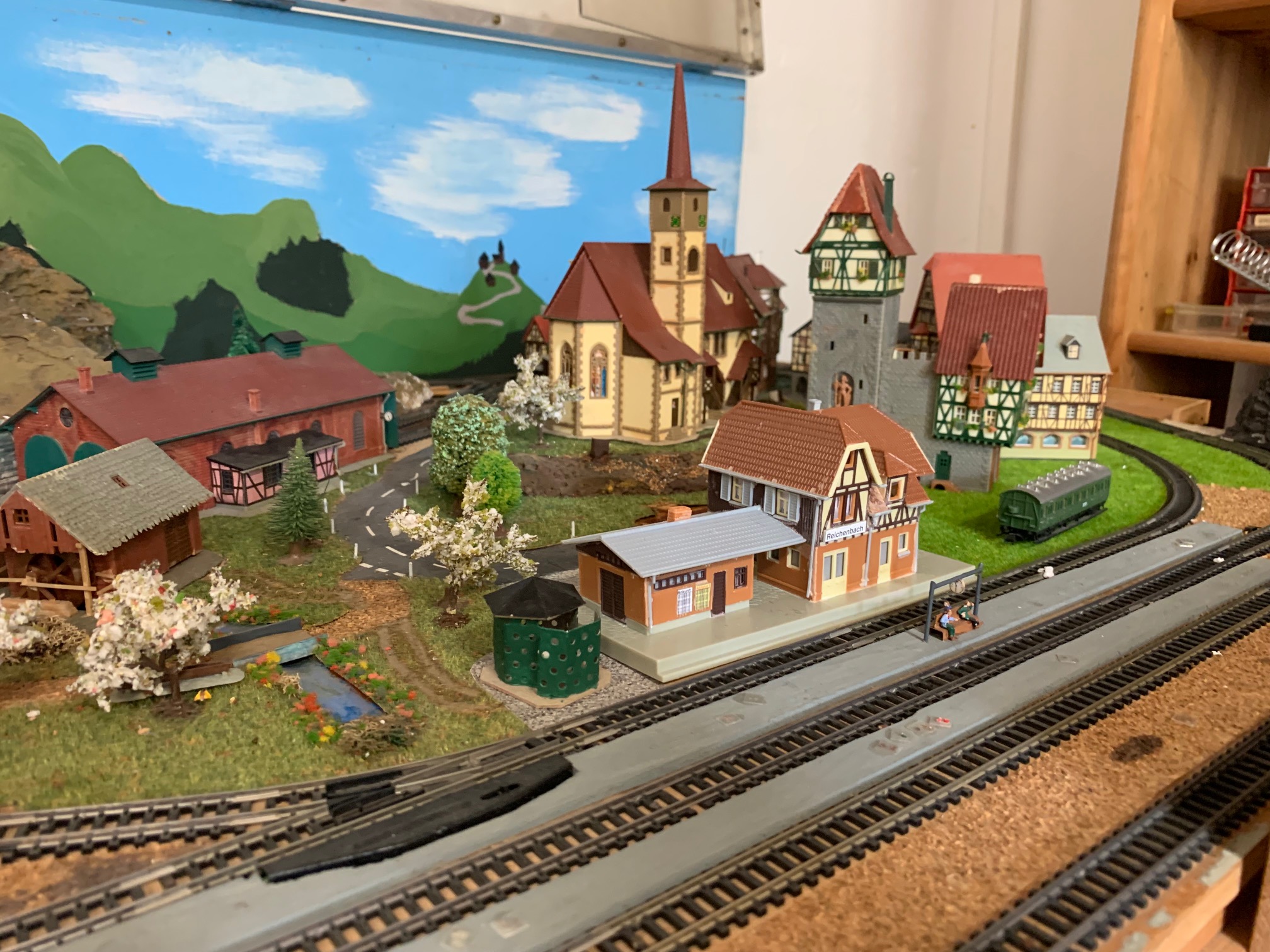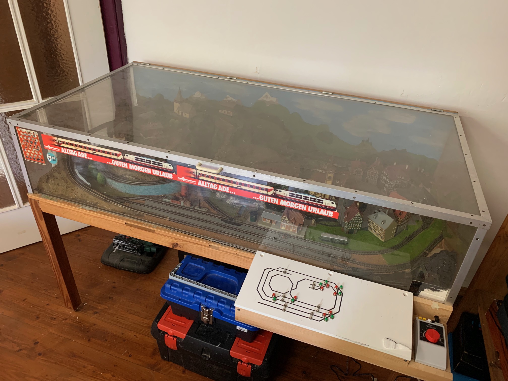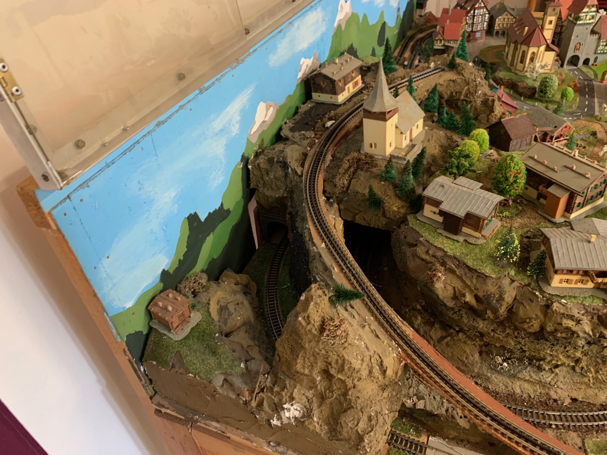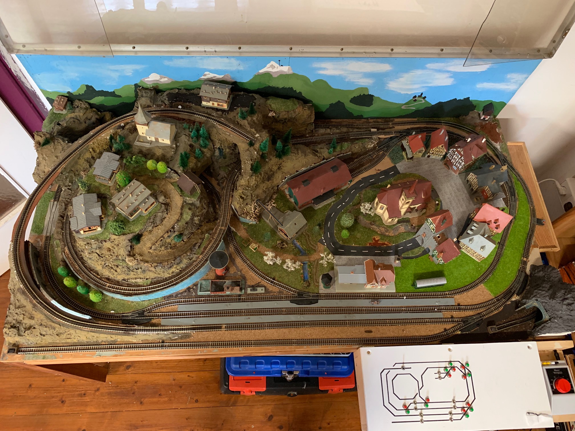 Die kleine Spur N Anlage wurde von Pepe in seiner Jugend gebaut und dann unter einer Plexiglas-Vitrine zwecks Staubschutz aufbewahrt. Im Winter 2023 wurde sie reaktiviert und auch mit einem Gleisbild Schaltpult ausgestattet. Es benötigt noch einiges an Arbeit, um die Details im Landschaftsbau herauszuheben. Trotz der geringen Grösse von nur 140 x 70cm, hat die Anlage sogar eine Zahnradbahn.