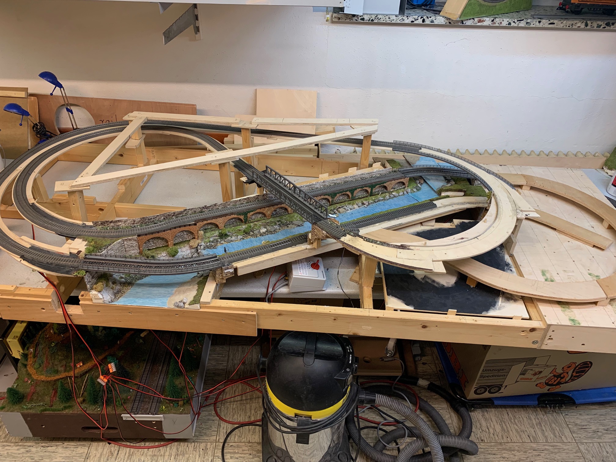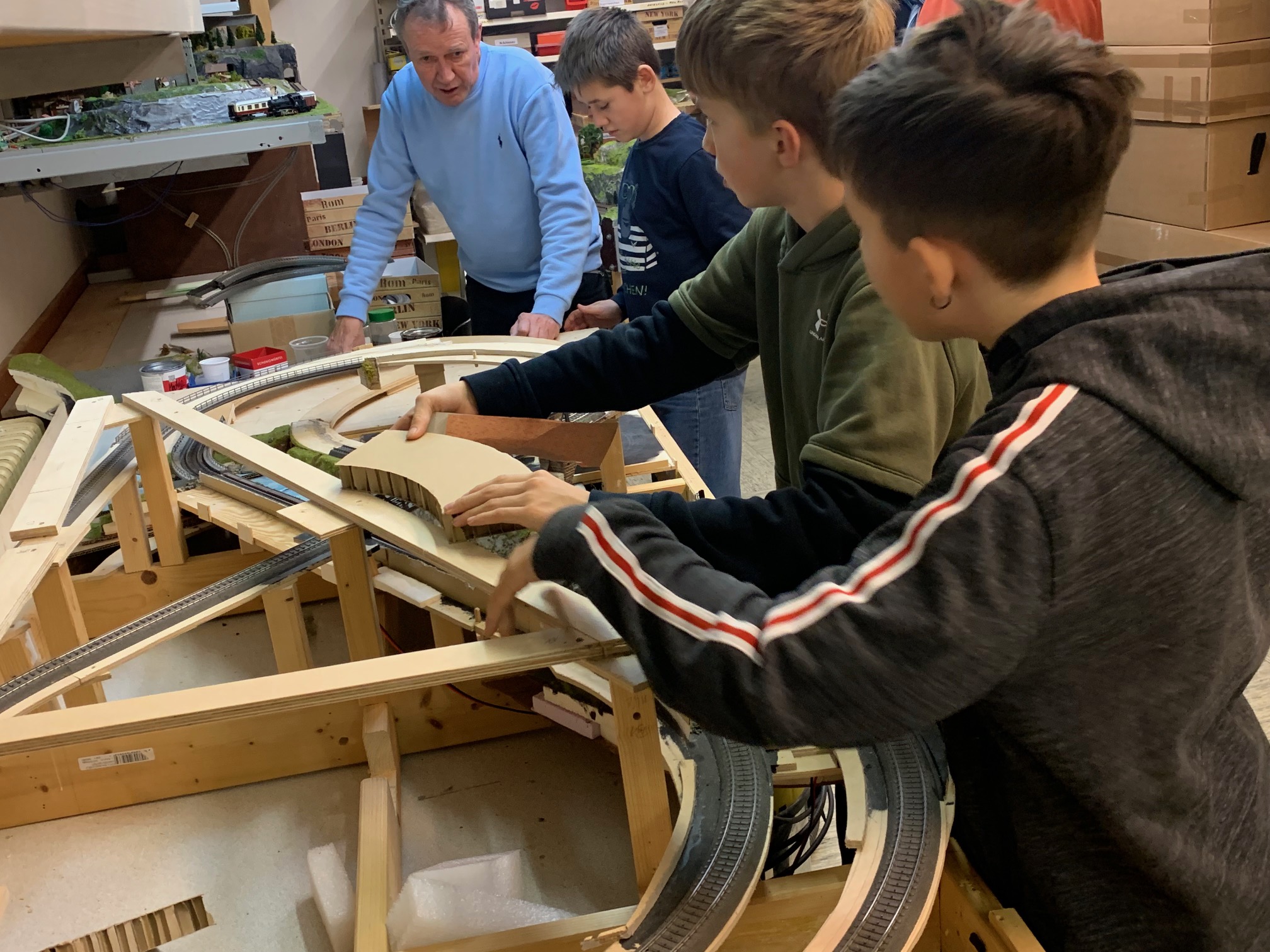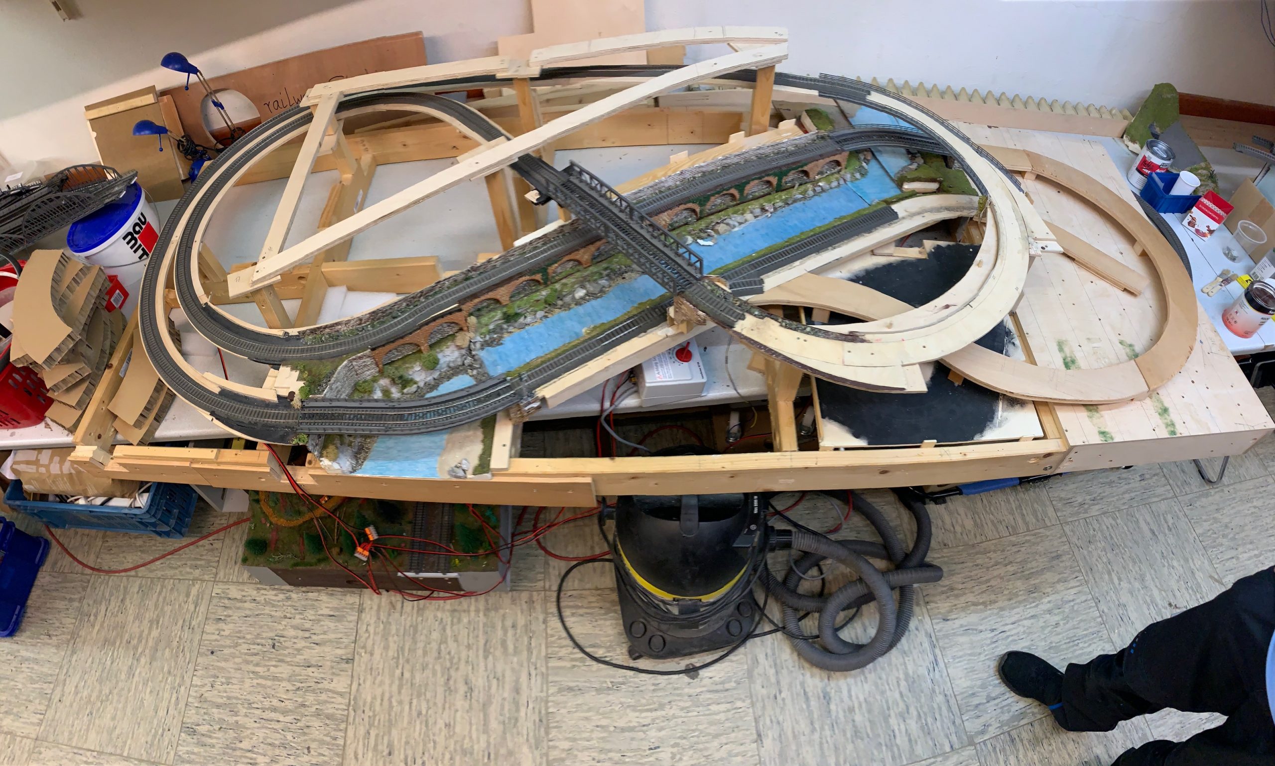 Aus einem Nachlass soll in Eigenarbeit unser Jugend eine komplett neue Kompaktanlage in Spurweite H0 entstehen. Der Umbau startete mit einem fast kompletten "Abriss" der ursprünglichen Grossanlage. In mehrwöchiger geduldiger Arbeit wurde die teils fertige Anlage zurück gebaut und für den Neuaufbau vorbereitet. Das Grundgestell sowie ein Teil des Gleisunterbaus wurde dabei erhalten. Auch ein Flussbett, dass vom Vorbesitzer in mühevoller Detailarbeit erstellt wurde, soll als Basis für den Neuaufbau erhalten bleiben.