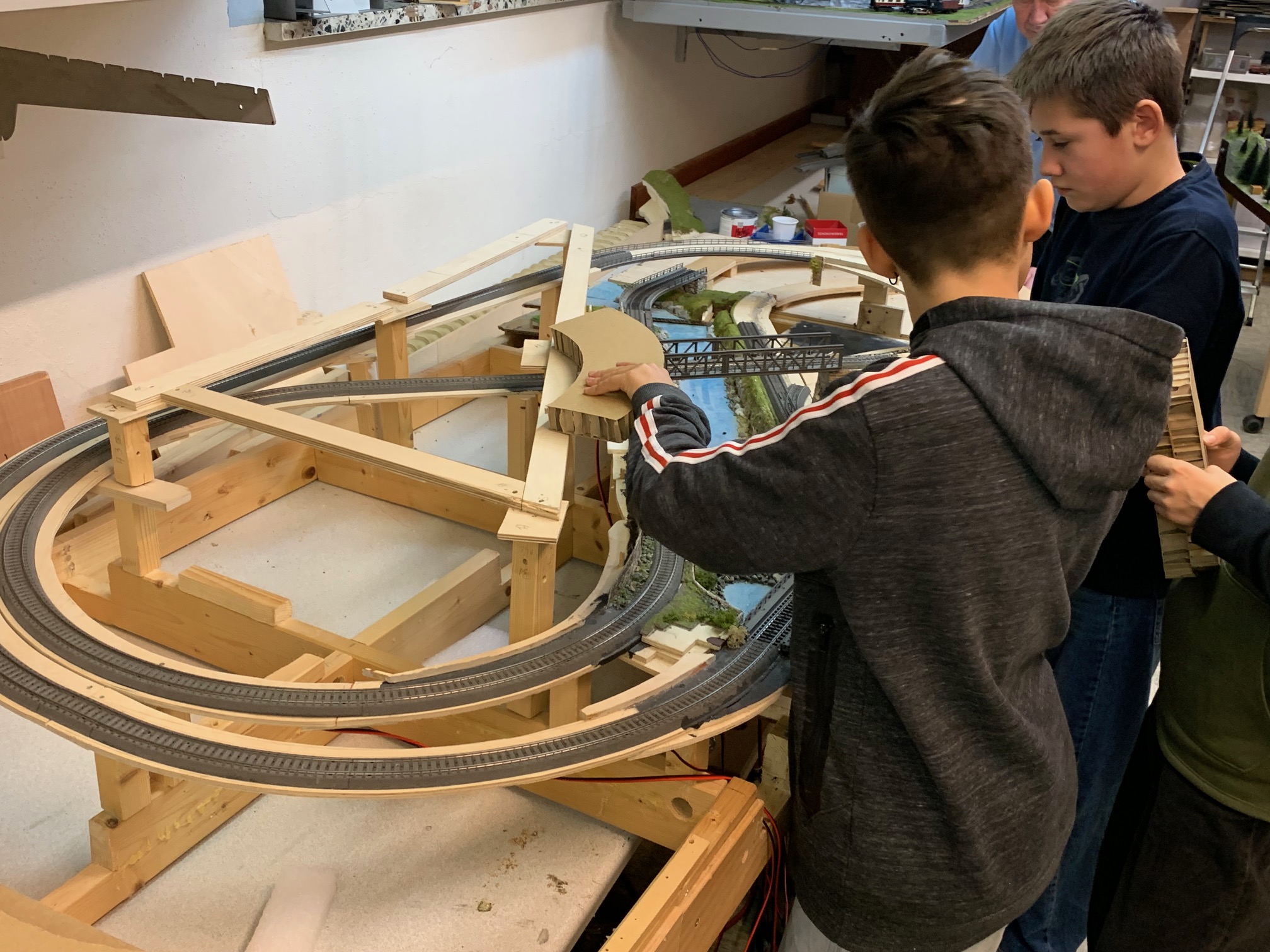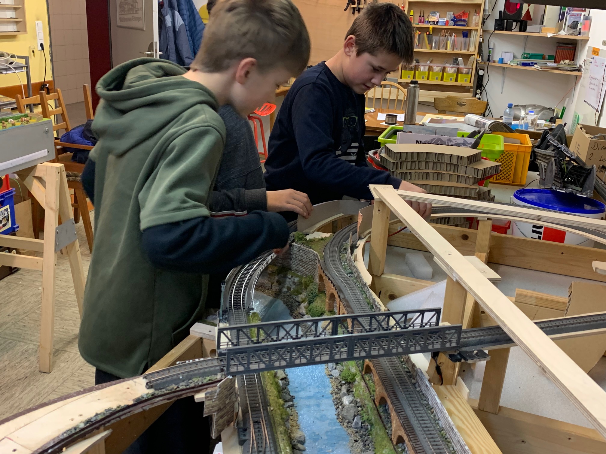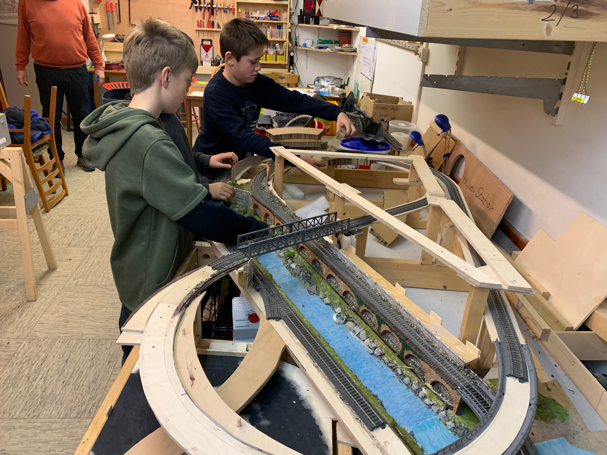 Aus einem Nachlass soll in Eigenarbeit unser Jugend eine komplett neue Kompaktanlage in Spurweite H0 entstehen. Der Umbau startete mit einem fast kompletten "Abriss" der ursprünglichen Grossanlage. In mehrwöchiger geduldiger Arbeit wurde die teils fertige Anlage zurück gebaut und für den Neuaufbau vorbereitet. Das Grundgestell sowie ein Teil des Gleisunterbaus wurde dabei erhalten. Auch ein Flussbett, dass vom Vorbesitzer in mühevoller Detailarbeit erstellt wurde, soll als Basis für den Neuaufbau erhalten bleiben.